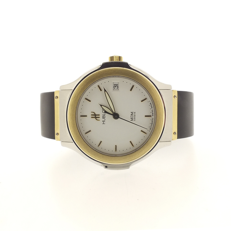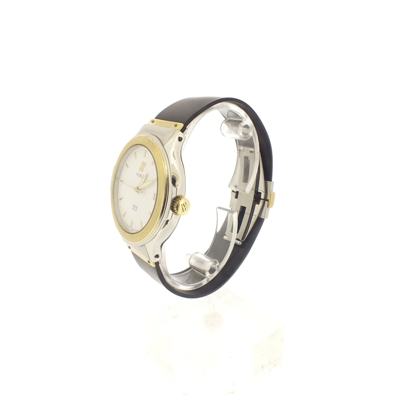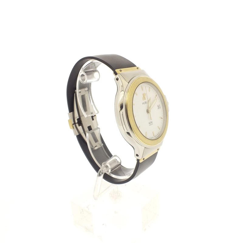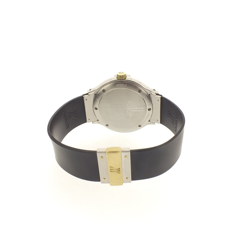 Reloj en acero y oro 18 K con correa de caucho, que es la seña de identidad de la marca. Maravillosa fusión de materiales para crear este elegante y cómodo reloj atemporal. Hublot deriva del diseño de la caja, inspirado en las escotillas de los barcos e identificable por el bisel, fijado con 12 tornillos que sirven de índices horarios.