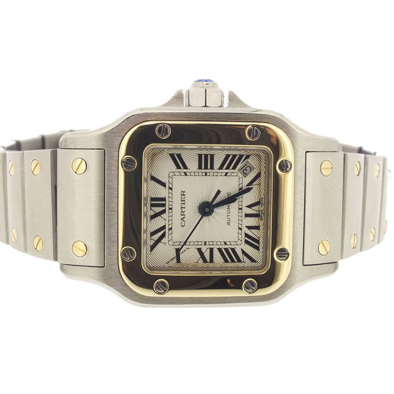 Cartier Santos es de los primeros relojes de pulsera y lleva el nombre en honor del aviador brasileño Alberto Santos Dumont. Los tornillos aparentes hacen de el un reloj mítico y fuente de inspiración de muchas marcas.