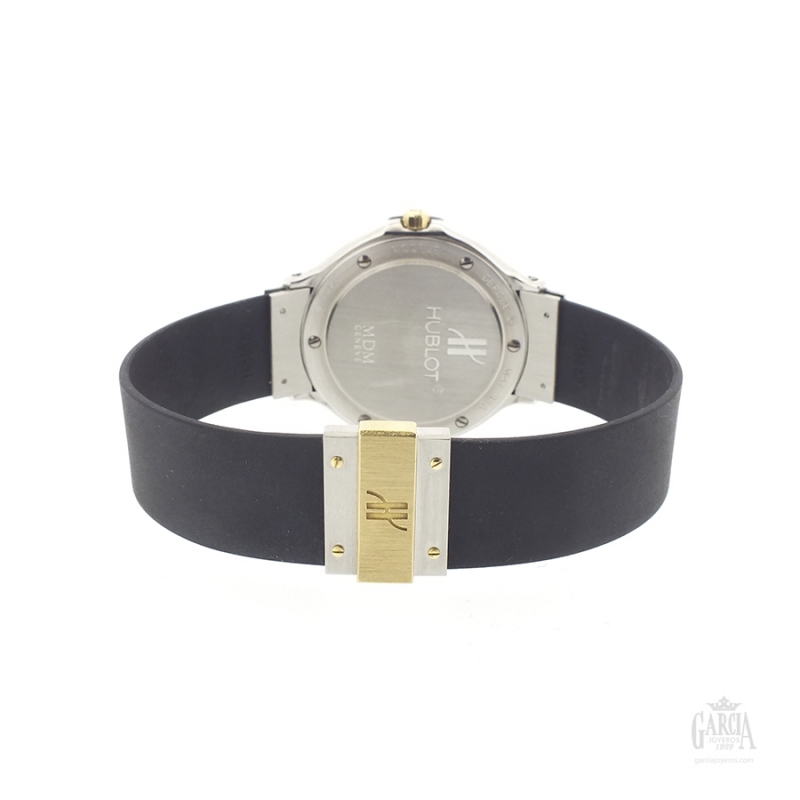 Cómodo y elegante reloj de señora en acero inoxidable y oro amarillo 18 K, lleva correa de caucho natural que le da un aire atemporal y lo convierte en un referente del buen gusto.