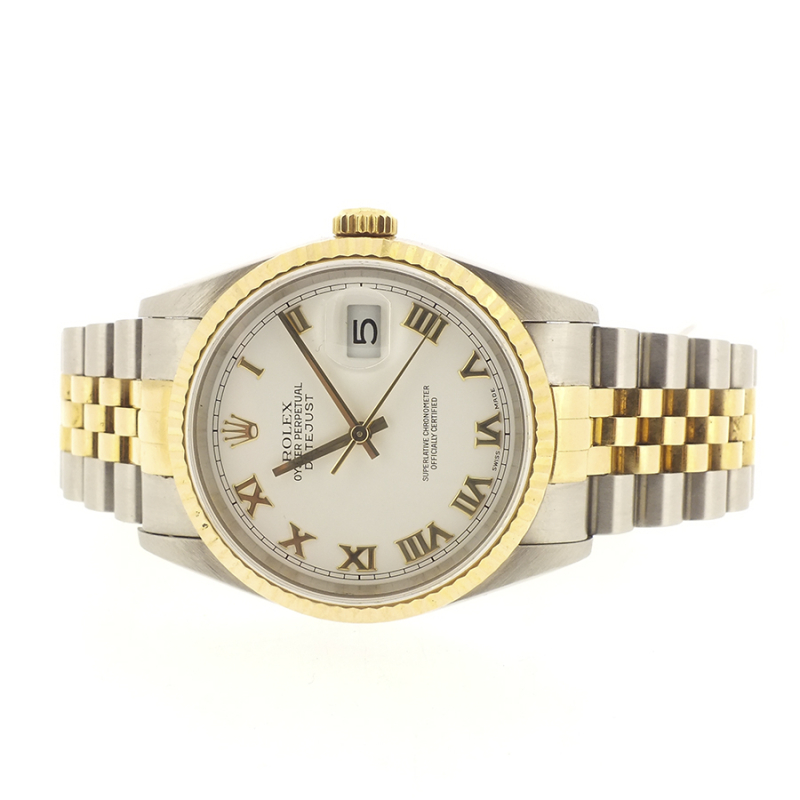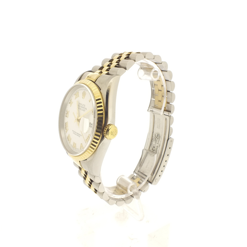 Rolex Oyster Perpetual Datejust en acero inoxidable y Oro 18 K. Movimiento Automático y cristal de zafiro. Pulsera Jubilee en acero y Oro 18 K. Esfera blanca, lleva calendario con lupa en el número 3. Construido con la calidad y la artesanía Rolex.